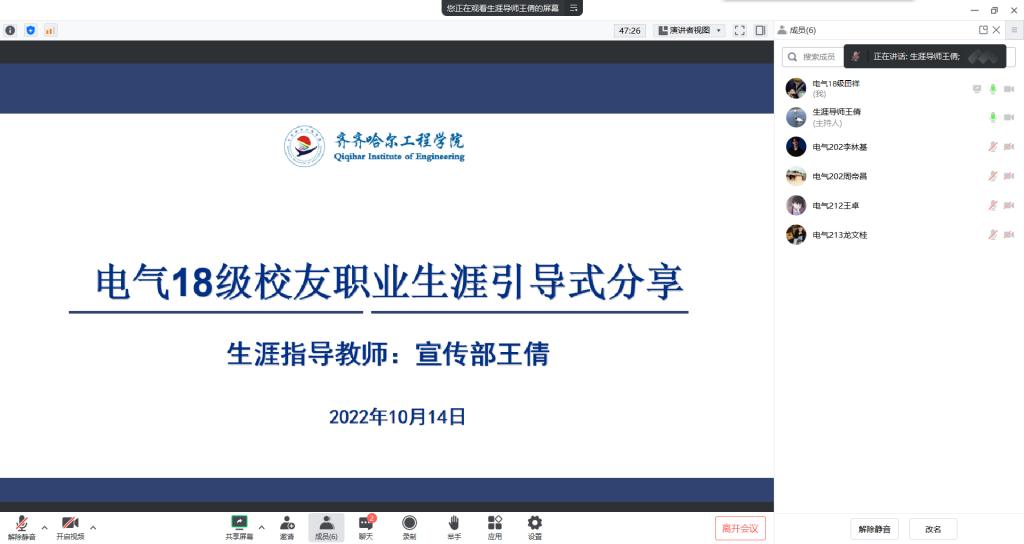 10月14日,生涯导师王倩邀请18级生涯学生田祥以线上的形式面向19级、20级、21级学生“现身说法”,发挥学长传帮带作用,分享求职经验,讲述生涯历程,鼓励并引导在校学弟坚定信心、历练成长,积极面对就业、面对生活。