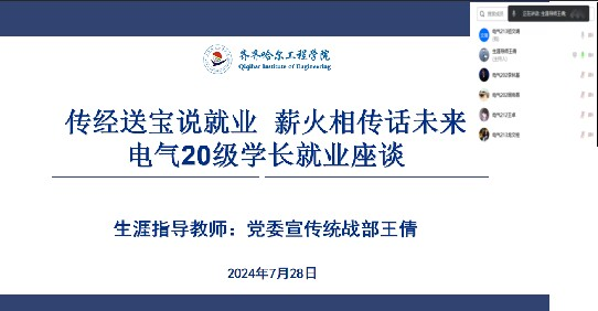 为说就业传经送宝,话未来薪火相传,生涯导师王倩组织电气20级求职经验分享会,邀请20级毕业生吴威标出席并代表20级学长发言,王倩全体生涯学生参加。