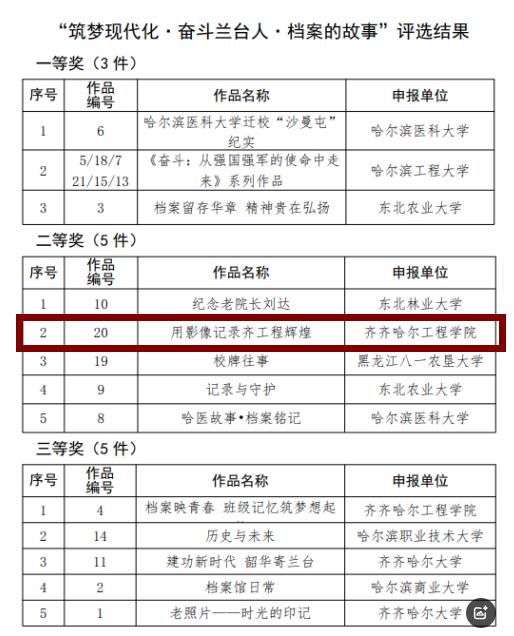 近日,黑龙江省高等院校档案学会关于开展 “筑梦现代化˙奋斗兰台人˙档案的故事” 短视频征集评选活动结果公布,我部兼职档案员隋亮参评作品《用影像记录齐工程辉煌》荣获二等奖。