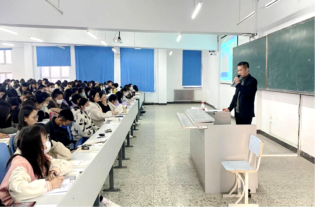 4月25日,在图书馆201教室,学校党委书记郭伟东走进《形势与政策》课堂,为健康与护理系2022级学生讲授思政课。
