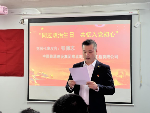 张德志同志代表中国能源建设集团进行发言。他从“为什么入党、入党后能做些什么”两个问题引入主题。用亲身经历,为全体党员诠释了什么是信仰,并从高度的政治责任与政治意识角度追忆了自己的入党初心,表示将以高度负责的敬业精神,用工作成绩践行自己的入党誓言与初心,同时,将对党的忠诚转化为对建筑事业的热情,对齐齐哈尔工程学院建设项目产教融合,校企合力育人的热情。他说:“人生在世,总要有一种信仰支撑我们,有了信仰,就用了动力,有了信仰生命征程就有了旗帜和明灯。”