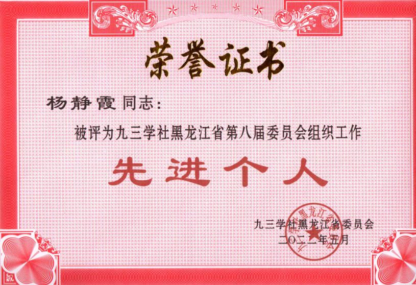 杨静霞老师被评“九三学社黑龙江省第八届委员会组织工作先进个人”。杨老师积极发展新社员,多次组织社员开展党史学习教育、黑龙江省高校思想政治工作专题培训、社会公益捐赠等活动。